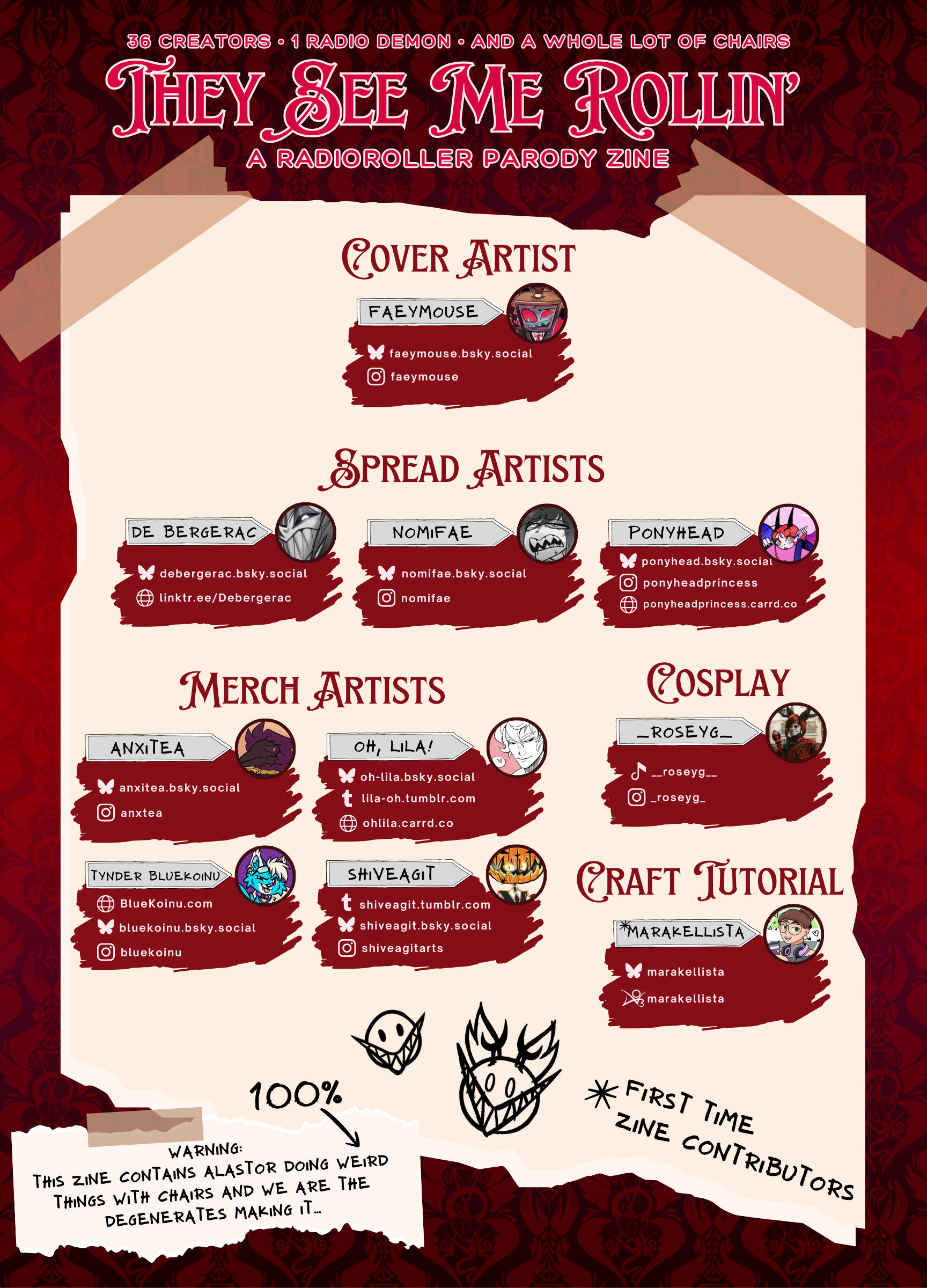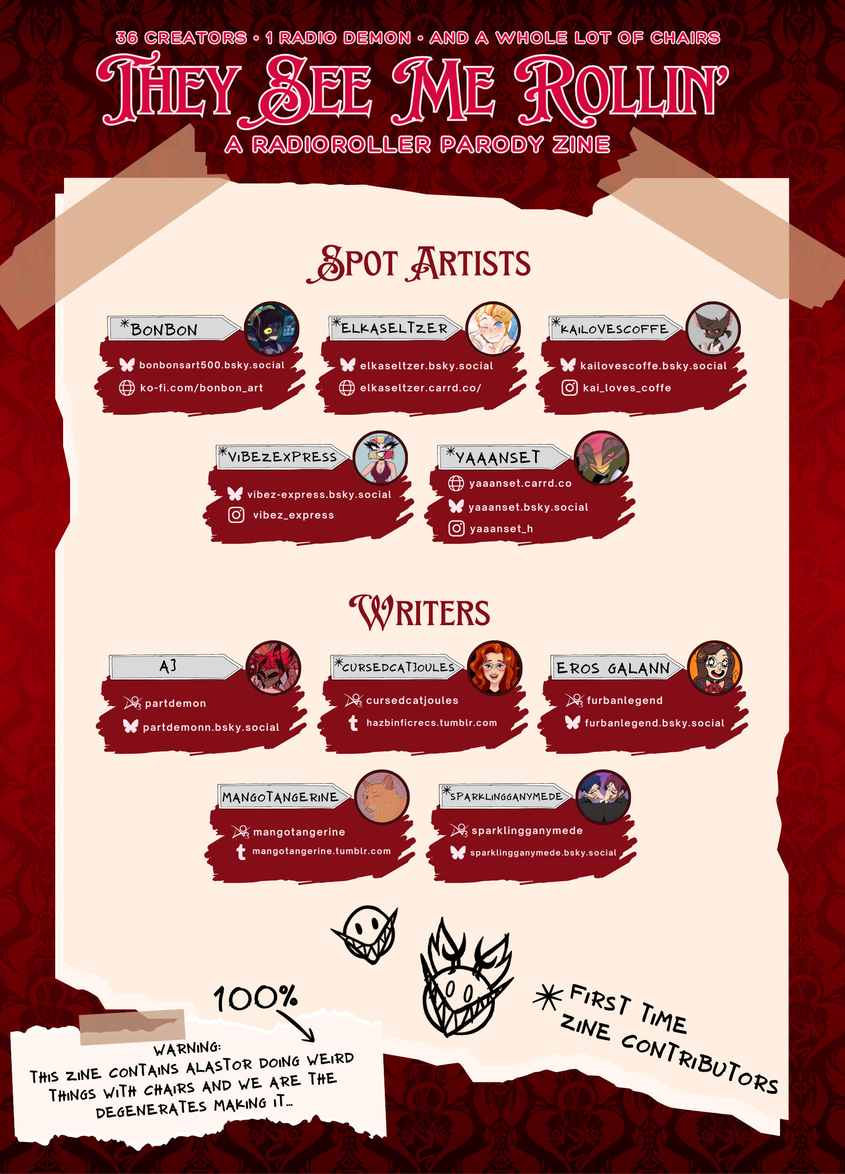They See Me Rollin’ is a Hazbin Hotel zine focused on the season 2 gag of Alastor and the Office Chair from Vee-Tower. This zine focuses on Alastor having a romantic and/or sexual relationship with the office chair (or any other chair). The zine intends to be 18+ NSFW, but contributors are welcome to produce SFW works as long as they are comfortable being published alongside NSFW content within the same book.